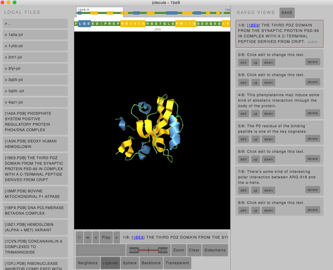 This will run the desktop version of Jolecule that allows you to directly read the PDB files on your drive. As well, there is a useful left-hand panel that will list all PDB structures in the current directory, with the TITLE field from the PDB files.